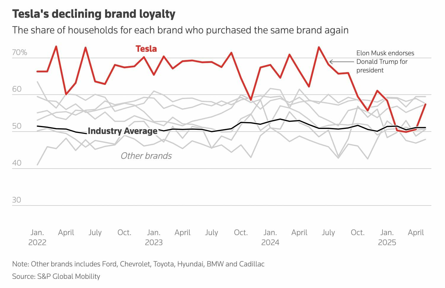 Trump’ın akla zarar hallerinden nasiplenmeyi hayal edip, cascavlak ortada kalanlar da var. Listenin başında Elon Musk geliyor. S&P Global Mobility’nin araştırmasına göre seçim dönemi ve sonrasında Trump’a yönelik desteği, Musk’ın sahibi olduğu Tesla’nın marka algısını çökertmiş. Haziran 2024’te yüzde 73 ile sektör lideri olan sadakat oranında Tesla, Mayıs 2025 itibarıyla yüzde 57’ye gerilemiş. Bu düşüşte modellerdeki başarısızlık ve fiyat gibi etkenler de var elbette.