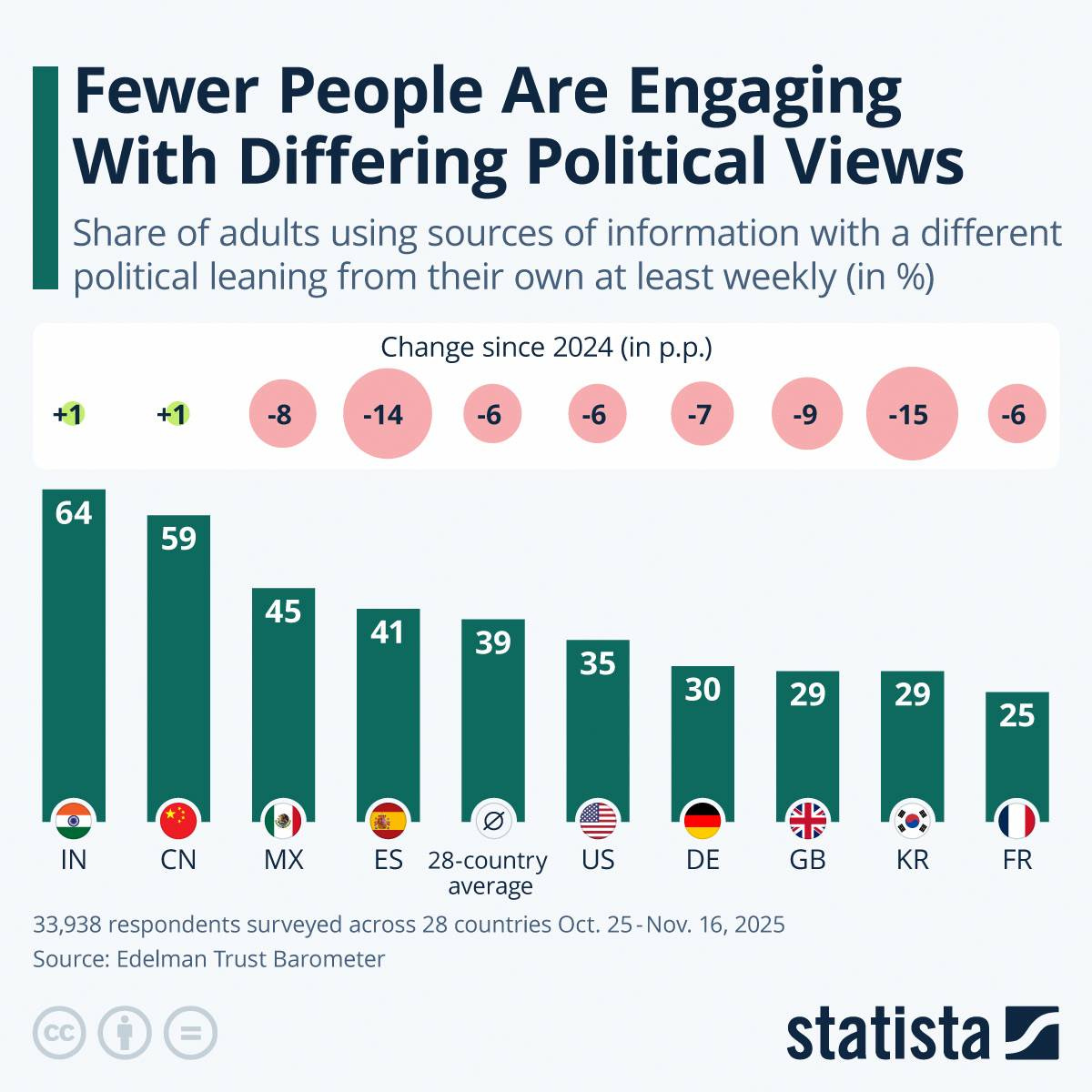Bu kadar güncel siyasete girmişken, bir de çağın kanseri “kutuplaşma” meselesine ait araştırma paylaşayım. “Edelman Güven Barometresi” raporuna göre kendisinden farklı siyasi görüşlere ait kaynaklara kulak verenlerin oranı dünya genelinde düşüyor.